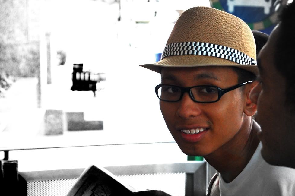 Aloof tying up the banner under hot sun. lucky got fedora. =)